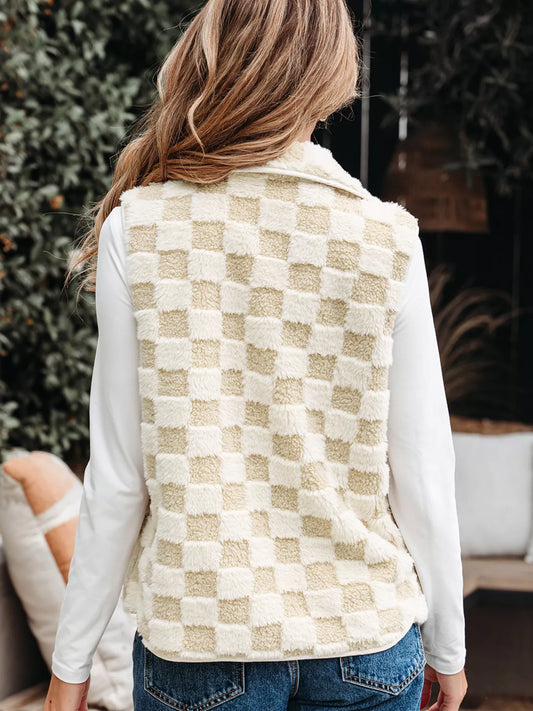 Sherpa Checkerboard Snap Button Vest Coat with Pocket
