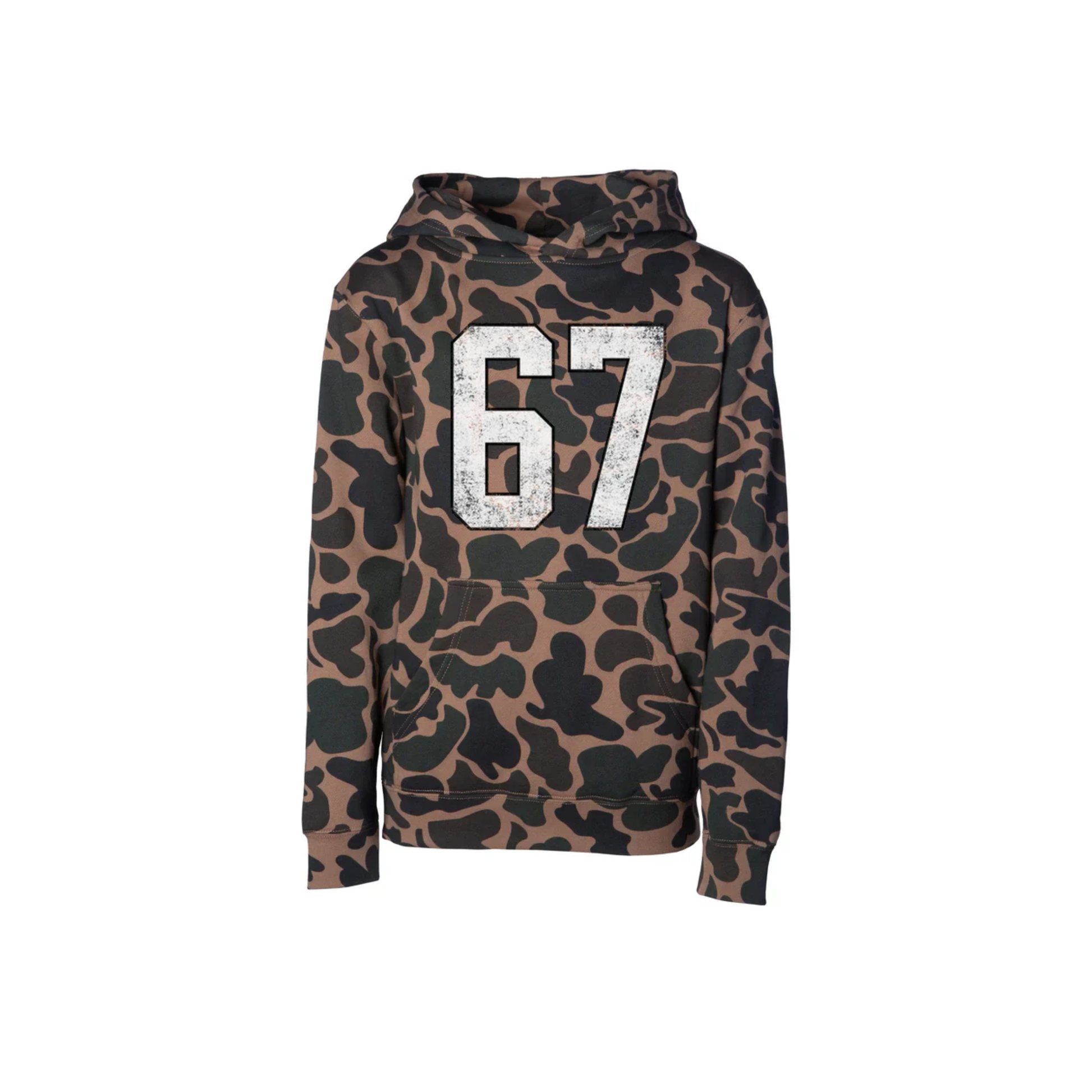 Made from a soft, durable fleece blend with an all-over camo print, this hoodie pairs well with jeans, joggers, or game-day outfits. The bold 67 varsity-style graphic gives it a cool athletic look that boys and girls love. Great for school, after-school activities, weekend adventures, or gifting.