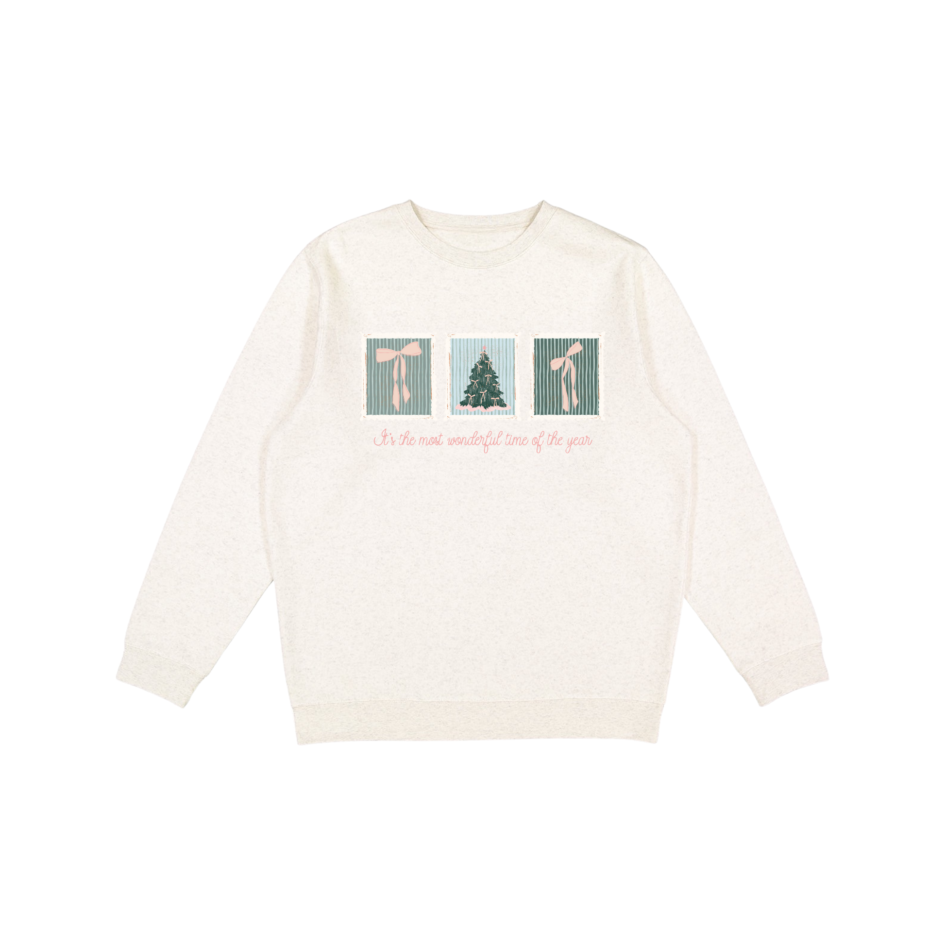 Spread seasonal joy with the It’s the Most Wonderful Time of the Year Graphic Sweatshirt—a delicate bow-and-tree block design with a vintage stitch feel. Minimal, festive, and perfect for matching sets.