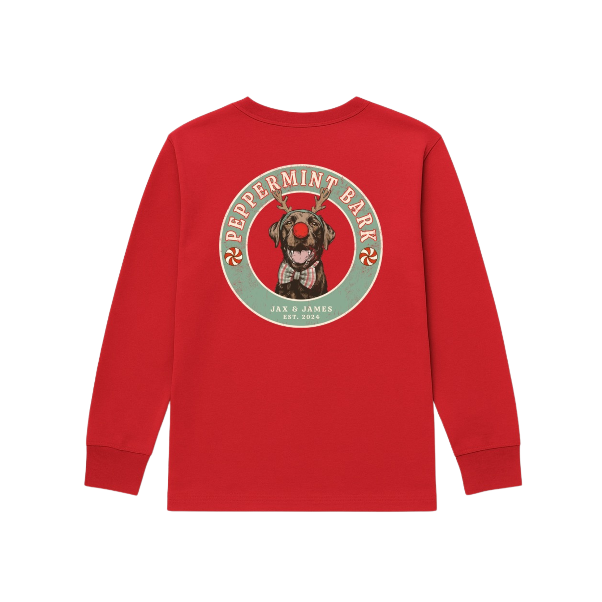 The cutest holiday tee for dog lovers. This festive “Peppermint Bark” design features a happy pup in reindeer antlers with vintage peppermint accents. A cozy, eye-catching Christmas classic you’ll wear all season.
